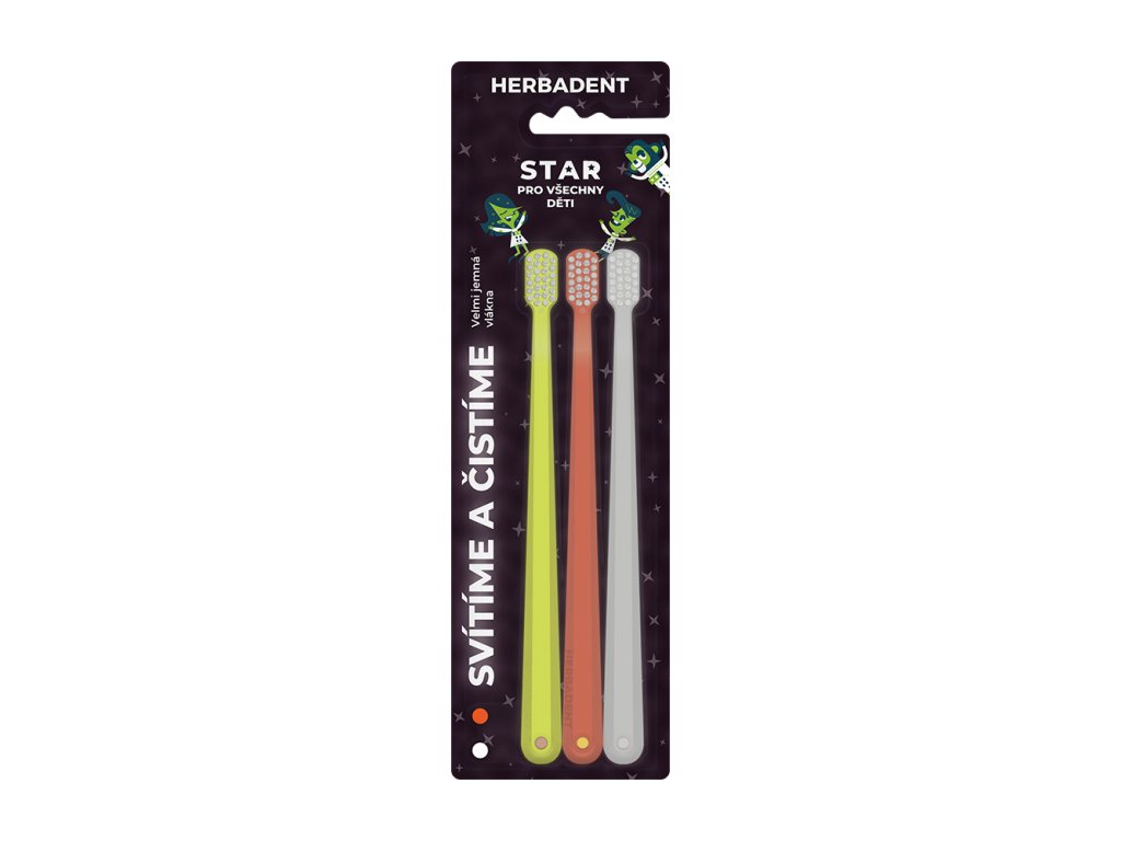 Zubní kartáčky HERBADENT STAR mají velmi jemná vlákna a jsou vyrobené z fosforeskujícího materiálu, který po nasvícení září.